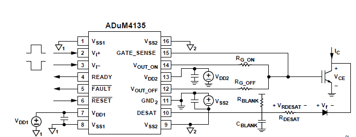 IGBT驱动电路主要由隔离驱动芯片及外围器件组成,驱动芯片采用ADI公司的隔离式栅极驱动器ADUM4135,集成了退饱和检测电路,并且具备降低噪声干扰的功能,提供高压下IGBT的短路工作保护。